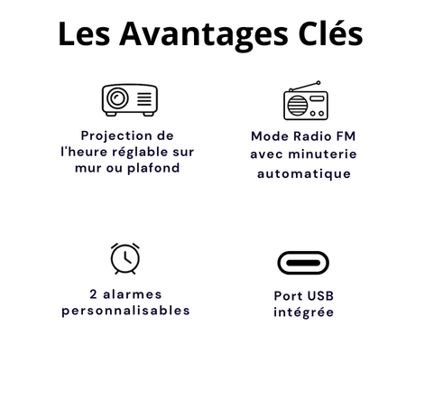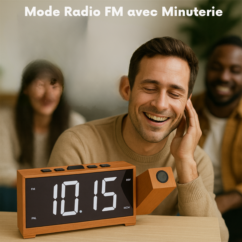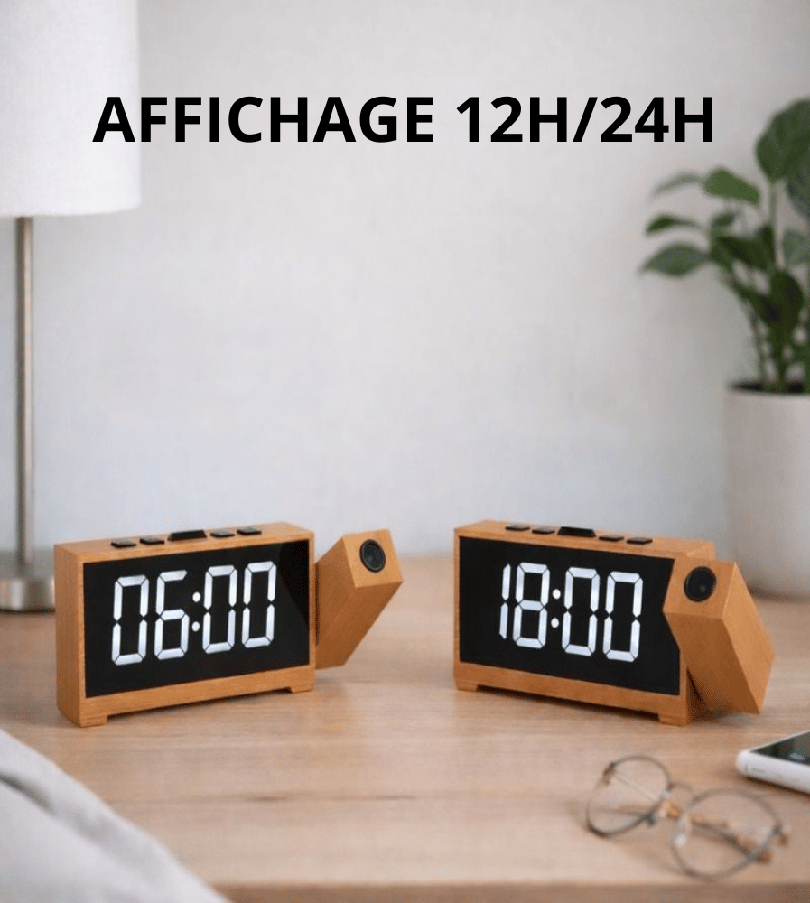 Grâce à sa projection murale ou plafond à 180°, l’heure est toujours visible, même la nuit, sans bouger la tête.