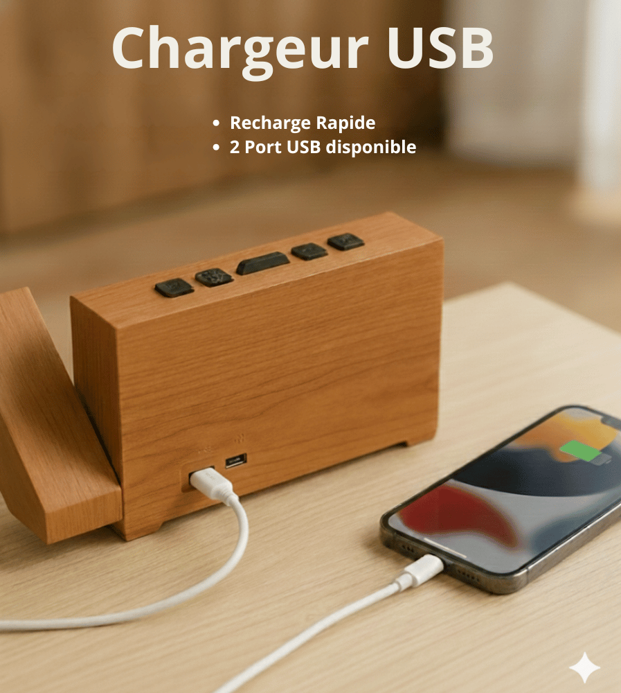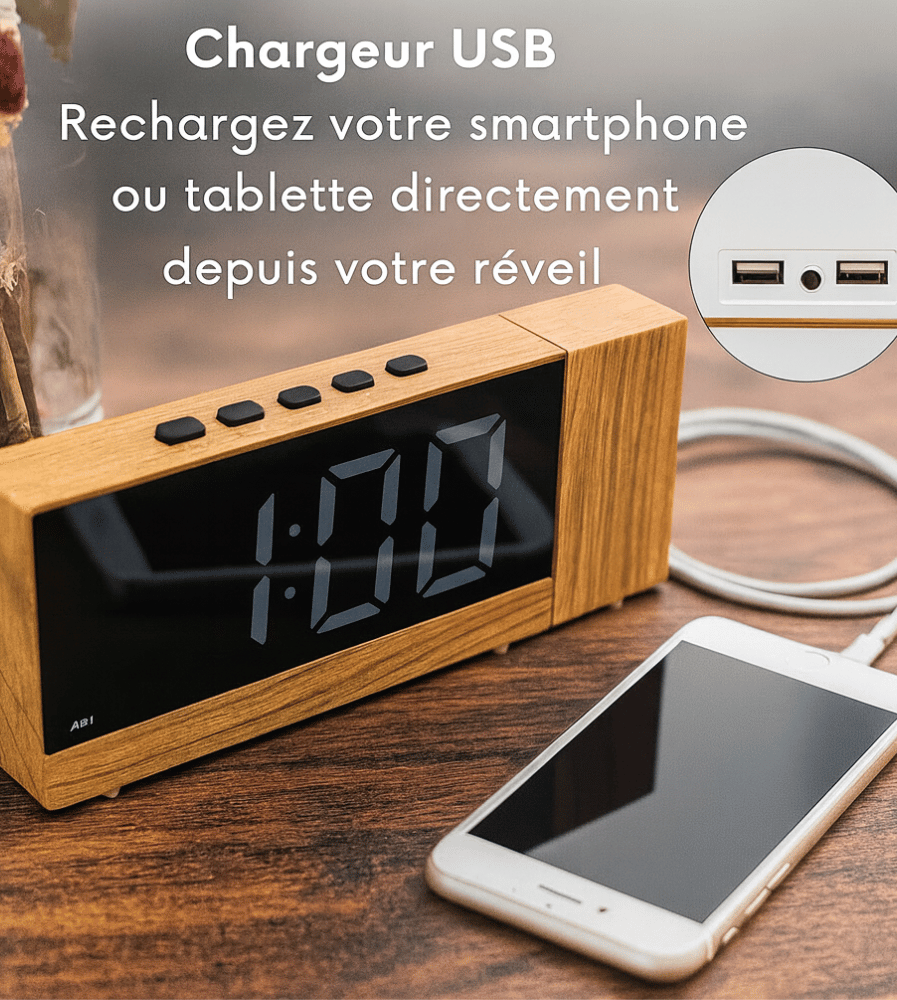 2 ports USB intégré rechargez votre Smartphone, Montre ou Tablette directement depuis votre réveil sans utiliser une prises électriques supplémentaire.